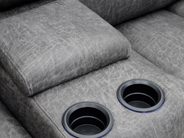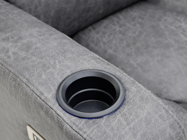 Suede fabric electric recliner featuring LED lights, cupholders, dropdown consoles and wireless phone charger! A fully loaded and practical take on a classic recliner design