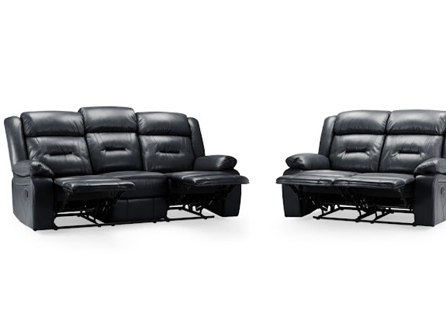 faux leather, grey faux leather and grey fabric and is available as a 3+2+armchair. Features padded arms and backs and a smooth manual reclining mechanism.